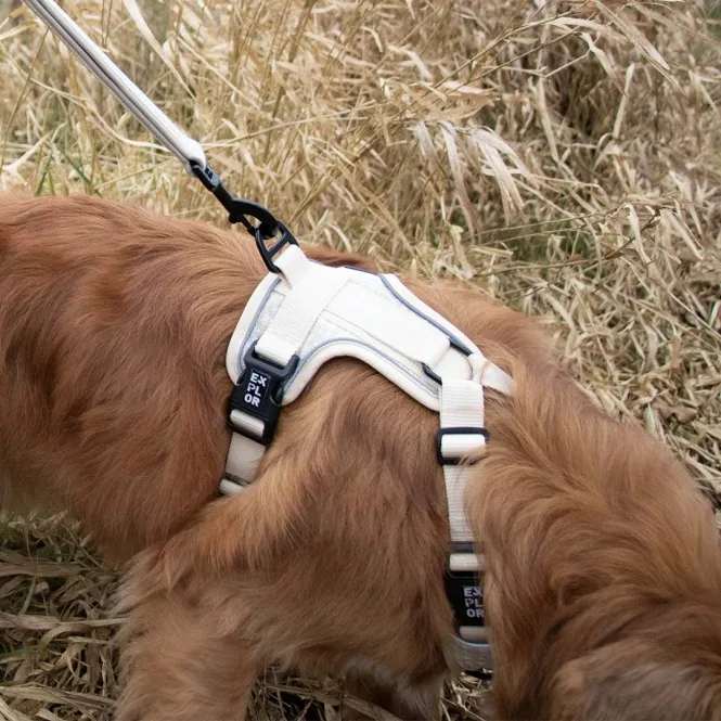 Verstellbar am Nacken und Brustkorb passt es sich nahtlos an. Robuste Edelstahlringe – einer dorsal für Ruhesuchende, ein verstärkter D-Ring vorne für Draufgänger – sorgen für sichere Führung. Praktische Schnallen mittig angebracht: Kein Beinheben nötig, einfach anlegen und los.