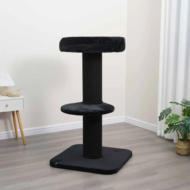 Der Kratzbaum bietet einen geräumigen Liegeplatz in luftiger Höhe, erreichbar über eine bequeme Trittstufe und eine praktische Zwischenstufe. Der breite Pfosten mit 19 cm Durchmesser ist vollständig mit robustem Sisal-Teppich ummantelt – ideal für intensive Krallentrainingssessions und langes Kratzvergnügen.