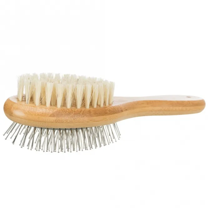 Diese beidseitige Bürste vereint Tradition und Innovation: Eine Seite mit sanften Naturborsten entwirrt behutsam und fördert die natürliche Ölfettverteilung. Die andere Seite mit Metallborsten und praktischen Noppen massiert tiefenwirksam, entfernt tote Haare und stimuliert die Haut.
