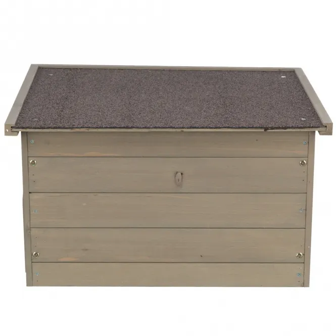 Aus lasiertem Kiefernholz gefertigt und speziell wetterfest imprägniert, trotzt dieses Haus Regen, Wind und Sonne. Das integrierte Dach mit hochwertiger Bitumendachpappe gewährleistet trockene Behaglichkeit, während die grau-grüne Optik nahtlos in Gärten und Freigehege übergeht.