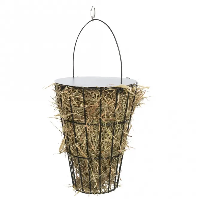 Diese elegante Heuraufe aus robustem, pulverbeschichtetem Metall hängt sich mühelos ein und sorgt für eine hygienische Futteraufnahme. Der integrierte Deckel minimiert Verletzungsrisiken und hält Staub sowie Verunreinigungen fern. Mit Maßen von ca. 16 x 21 cm (Durchmesser x Höhe) passt sie perfekt in jeden Stall oder Käfig.