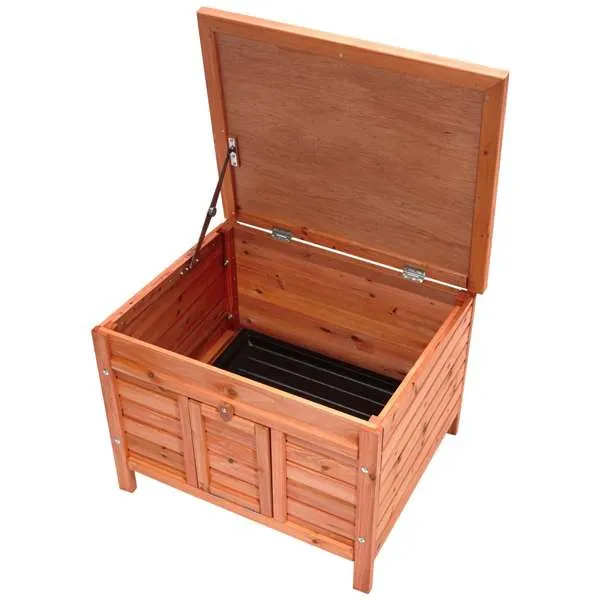 Gefertigt aus lasiertem Kiefernholz, das natürliche Witterungsbeständigkeit bietet und ein ansprechendes, rustikales Aussehen verleiht. Das Dach ist mit besanderter Pappe versehen und lässt sich bequem von oben öffnen – perfekt für tägliche Kontrollen.