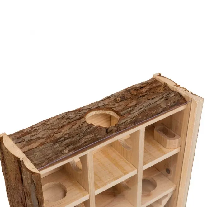 Dieser Spielturm aus hochwertigem Rindenholz fasziniert mit zwei bequemen Zugängen, neun geräumigen Kammern, zwei einladenden Treppen und einem integrierten Futternapf. Eine transparente Kunststoffscheibe ermöglicht spannende Beobachtungen, ohne die Tiere zu stören. Mit kompakten Maßen von ca. 30 x 30 x 10 cm passt er perfekt in jedes Kleintierheim.