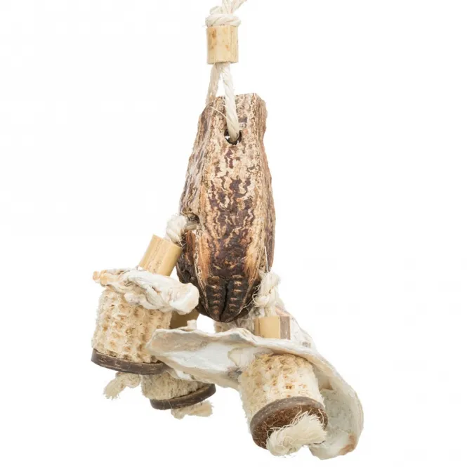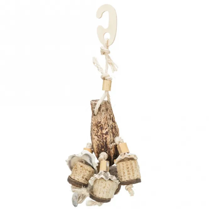 Vielfältige Naturmaterialien wie robuste Mahagonischote, glänzende Muscheln, fester Bambus und knackige Maiskolben bieten endlosen Kau- und Zerkleinerungsspaß. Entwickelt in enger Kooperation mit dem renommierten Weltvogelpark Walsrode, kombiniert es Spieltrieb mit artgerechtem Design. Mit einer Länge von rund 26 cm eignet es sich ideal für Großsittiche und Wellensittiche, die ihre Schnäbel und Krallen auspowern möchten.