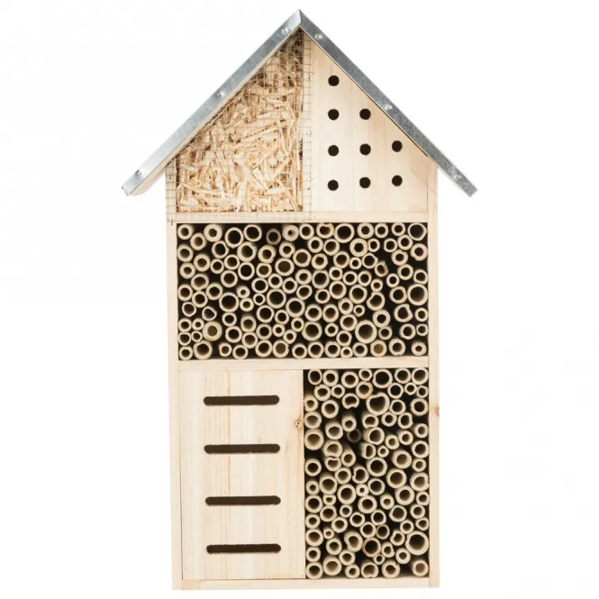 Dieses Hotel aus unbehandeltem Kiefernholz und robustem, verzinktem Metall schafft zwölf speziell gestaltete Kammern. Bambusrohre laden Solitärbienen ein, Rindenstücke bieten Marienkäfern Unterschlupf, und präzise Bohrlöcher dienen als Nester für weitere Nützlinge. Das geneigte Dach weist Regen ab und gewährleistet trockene, sichere Plätze – ganzjährig ein Hort für die kleinen Helfer.