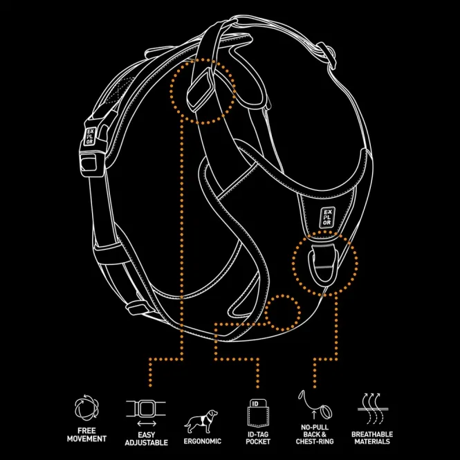 Perfekt für urbane Erkundungen oder wilde Abenteuer: Dieses Geschirr gewährleistet uneingeschränkte Bewegungsfreiheit, während Druck gleichmäßig verteilt wird. Zwei robuste Edelstahlringe – einer am Rücken für entspannte Gänge, ein verstärkter D-Ring vorne für aktive Partner – bieten vielseitige Führung.