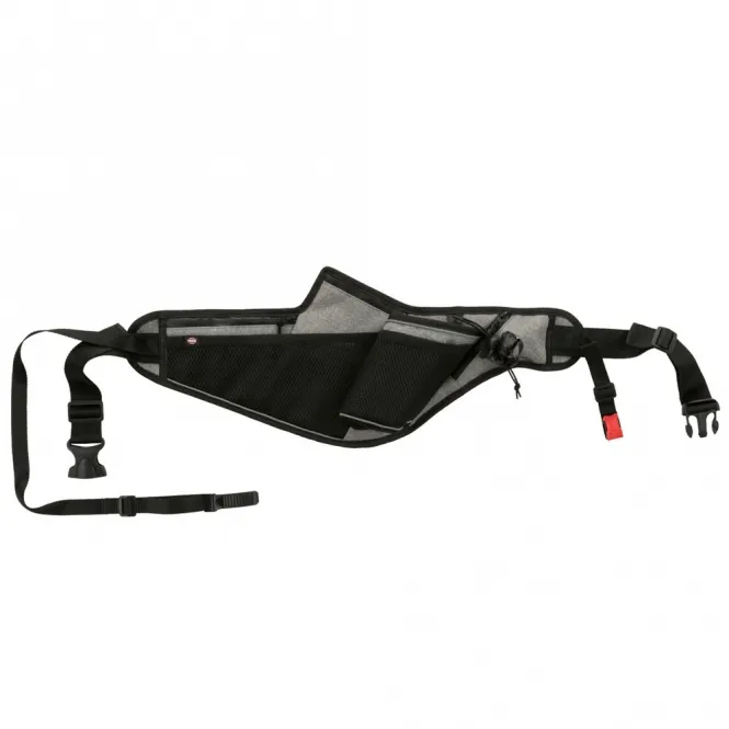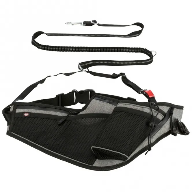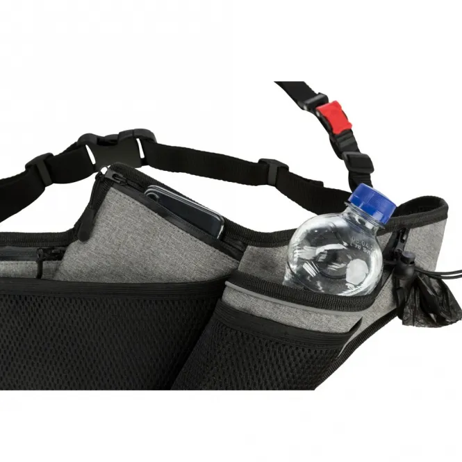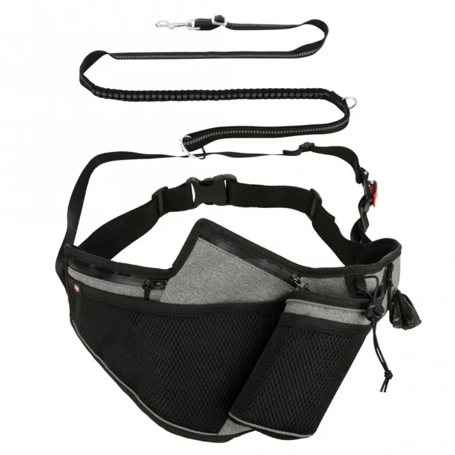 Praktische Taschen, ein stabiler Getränkehalter und ein integrierter Kotbeutelspender halten alles Wichtige griffbereit. Wasserdichte Reißverschlüsse trotzen Regen, reflektierende Streifen gewährleisten Sichtbarkeit in der Dämmerung. Das wasserabweisende Gurtband widersteht jedem Wetter – passend für Bauchumfänge von 70 bis 130 cm, mit verstellbarer Leine von 1,15 bis 1,50 m bei 20 mm Breite.