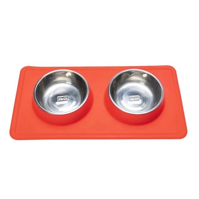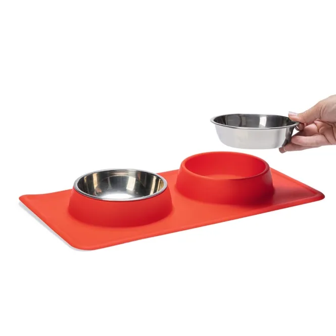 Entdecken Sie den perfekten Begleiter für Mahlzeiten: Ein stilvolles Set in lebendigem Rot, das Sauberkeit und Komfort für Ihren Hund vereint.
