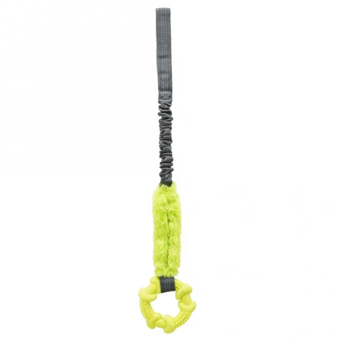 Dieses clevere Spielzeug kombiniert einen robusten TPR-Ring mit einem flexiblen Bungee-Ruckdämpfer aus Polyester. Der Durchmesser des Rings beträgt etwa 10 cm, die Gesamtlänge ca. 56 cm – perfekt dimensioniert für intensive Zugsessions. Der integrierte Ruckdämpfer federt starke Züge ab und schont so die Gelenke von Hund und Halter.