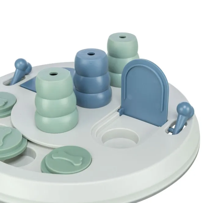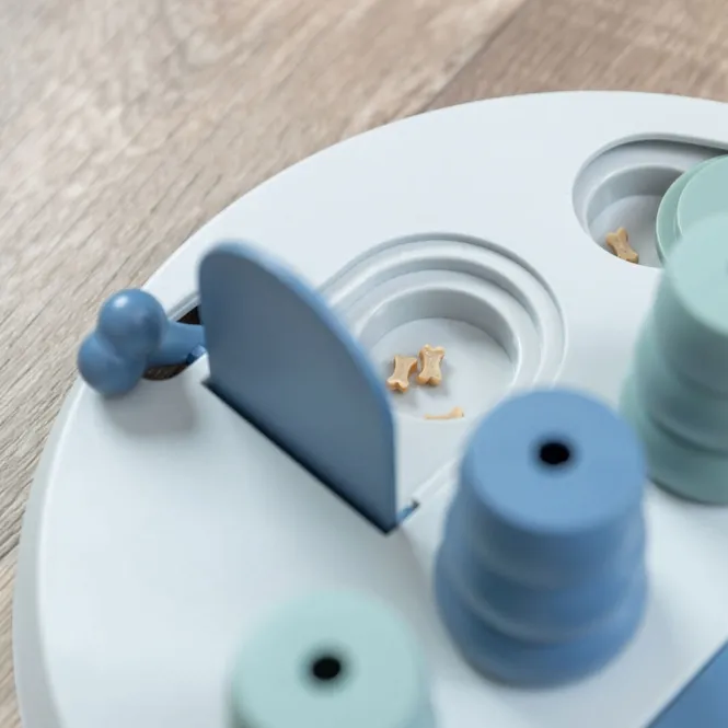 Dieses großformatige Brettspiel mit ø 28 cm lädt zu abwechslungsreichen Herausforderungen ein: Drei stabile Kegel zum Umwerfen, Vertiefungen mit klappbaren und schiebbaren Deckeln – perfekt gefüllt mit Snacks Ihrer Wahl. Ihr Hund nutzt Pfote und Schnauze, um die Belohnungen zu erobern. Der integrierte Gummiring sorgt für rutschfesten Halt auf jedem Boden, während der robuste Kunststoff langlebige Action garantiert.