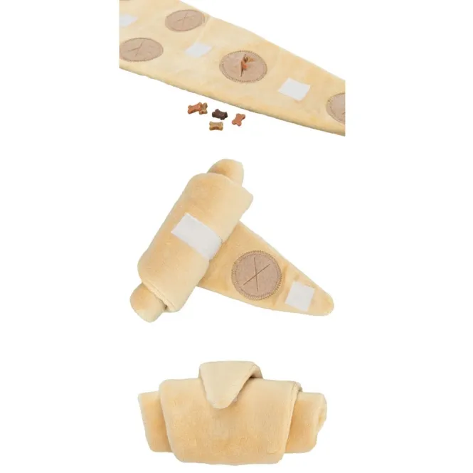 Dieses geniale Croissant aus hochwertigem Plüsch lädt zu aktiver Beschäftigung ein. Rollen Sie es auf, füllen Sie die versteckten Fächer mit Lieblingsleckerlis oder Trockenfutterkroketten und verschließen Sie es sicher mit dem praktischen Klettverschluss. Ihr Hund muss nun mit Schnauze und Pfoten tricksen, um Stück für Stück an die Belohnung zu gelangen – pure Intelligenzförderung pur!