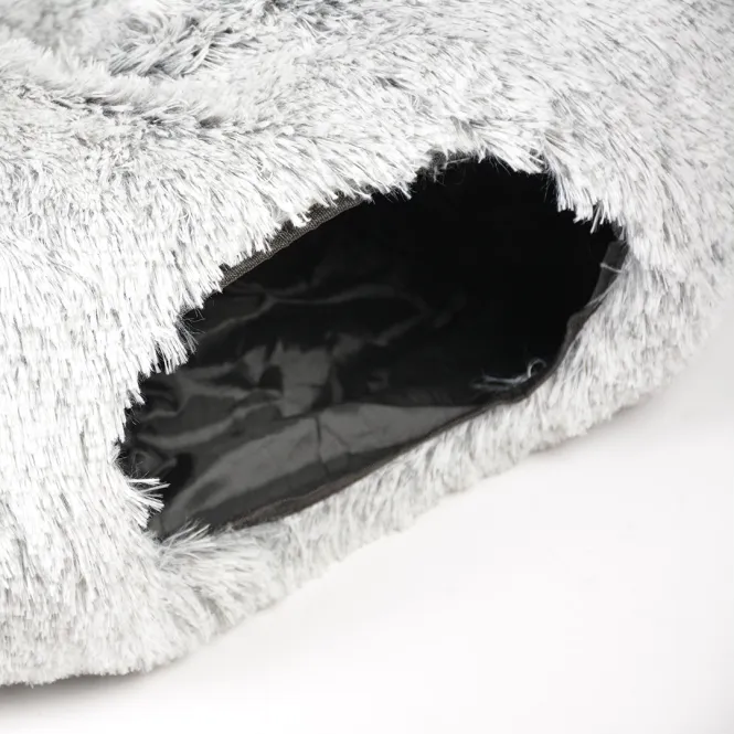 Stellen Sie sich vor, Ihre Katze schlüpft spielerisch durch den geräumigen Tunnel, umgeben von superweichem Plüsch, der sich wie eine Wolke anfühlt. Innen wartet der schwarze Knisterfilm auf abenteuerliche Geräusche, die Neugier wecken und Bewegungen anregen. Die große Öffnung verwandelt sich mühelos zum breiten Rand des zentralen Bettes – perfekt für ausgiebige Nickerchen.