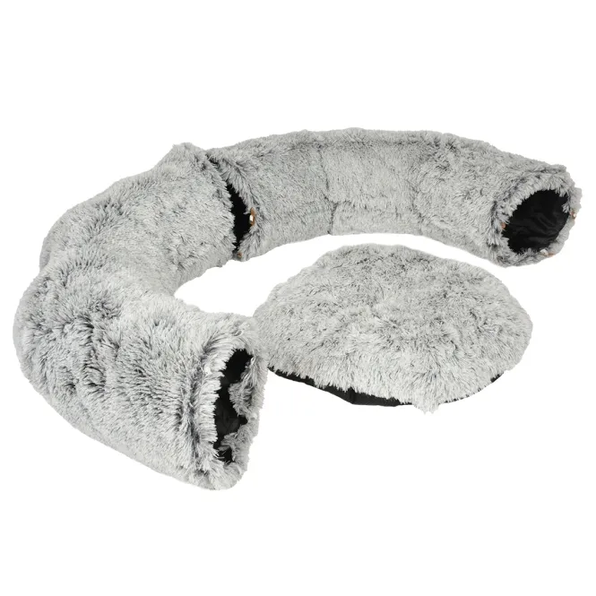 Tauchen Sie ein in pure Katzenfreude: Ein smarter Tunnel, der nahtlos zum kuscheligen Donutbett wird – alles in elegantem Hellgrau für endlosen Spaß und Erholung.