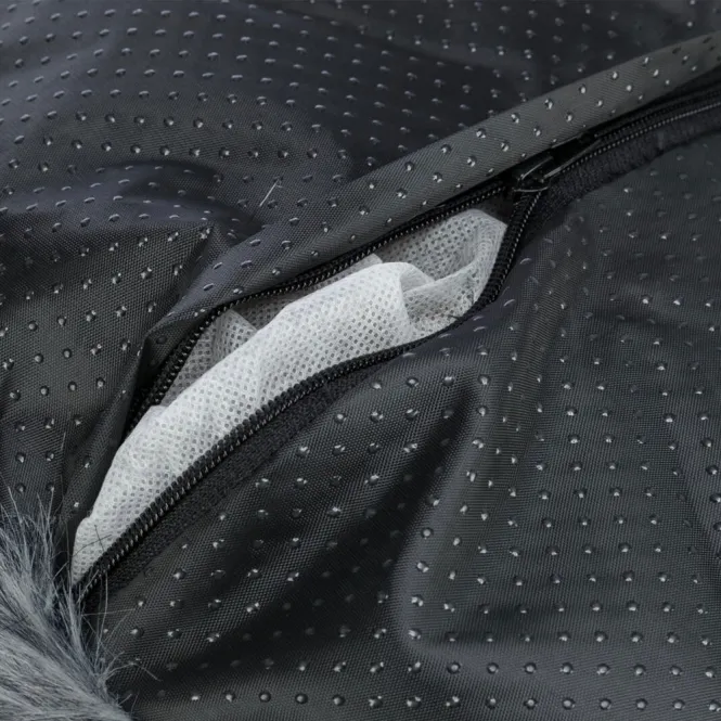 Der weiche Langhaar-Plüschbezug aus hochwertigem Polyester umhüllt das integrierte Kissen und lädt zu ausgiebigen Entspannungsphasen ein. Die Füllung aus Polyestervlies sorgt für optimale Formstabilität und langanhaltenden Komfort.