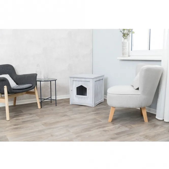 Dieses elegante Katzenhaus aus lackiertem Sperrholz in sanfter Grau-Nuance bringt Retro-Flair in jeden Raum. Perfekt, um die Katzentoilette diskret zu verbergen, während es Streu-Austritt zuverlässig verhindert. Die magnetisch schließende Tür sorgt für einfachen Zugang und sicheren Halt – ideal für natürliche Bedürfnisse.
