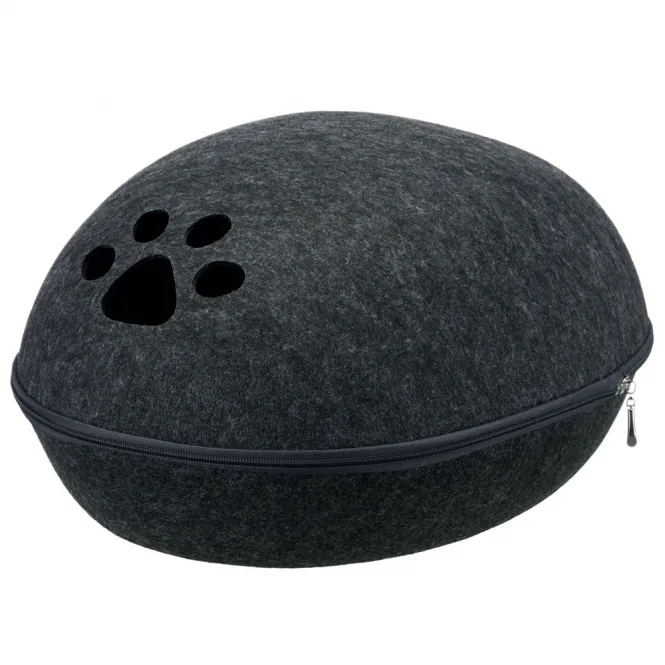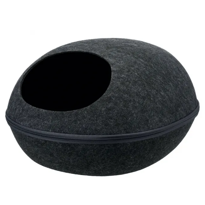 Dank des praktischen Reißverschlusses öffnet sich die Höhle vollständig – ideal zum platzsparenden Verstauen oder als offenes Bett ohne Dach. Maße von ca. 40 x 24 x 47 cm in edlem Anthrazit passen sich harmonisch jedem Interieur an.