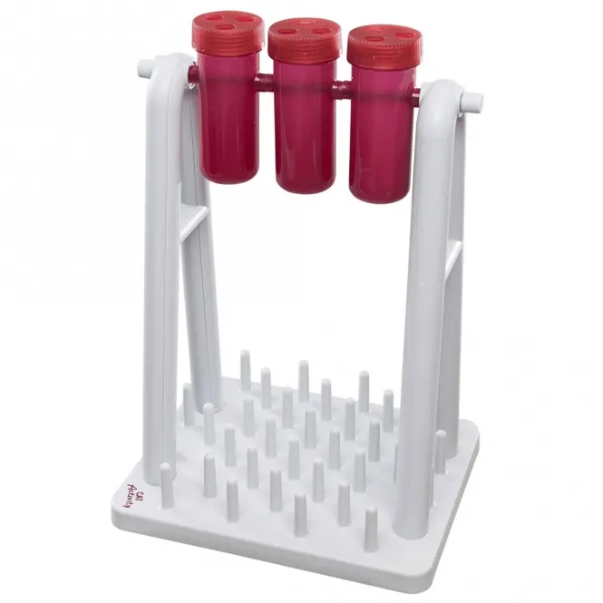 - Becher drehen, bis Leckerlis auf die zapfenbesetzte Platte fallen.