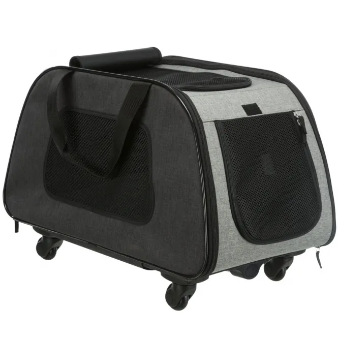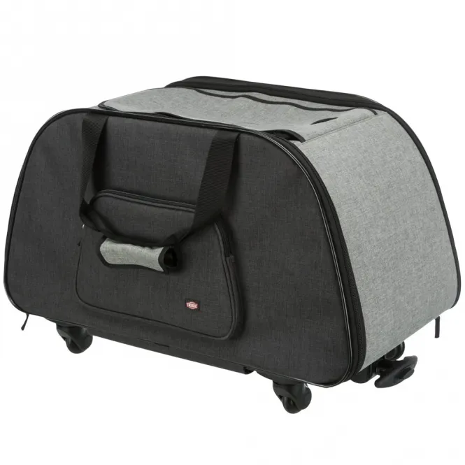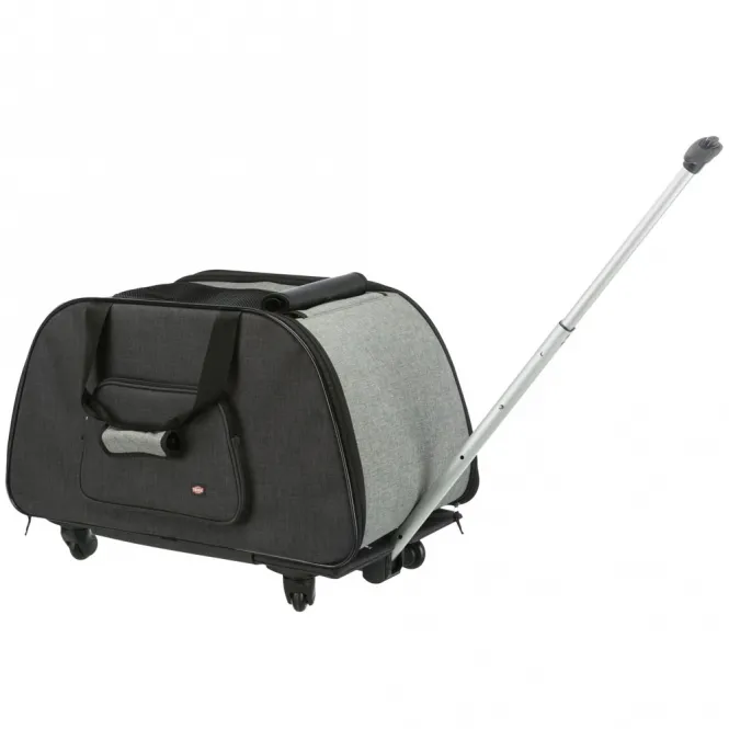 Ein integriertes Nebenfach fasst Trinkflasche, Leckerlis oder Spielzeug sicher weg. Das abnehmbare Polsterbezug ist bei 30 °C handwaschbar, und das Nylongewebe lässt sich kinderleicht abwischen. Zusammengeklappt misst der Trolley kompakt 70 x 39 x 16 cm – platzsparend verstaut und immer griffbereit. Außenmaße: 65 x 38 x 44 cm, Tasche ohne Fahrwerk: 35 cm Höhe.