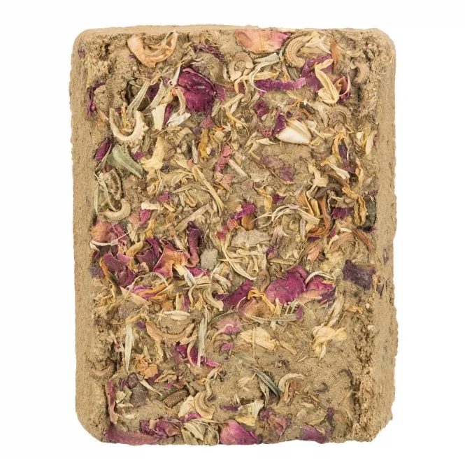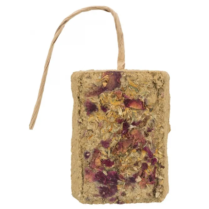 Dieser Lehmstein aus purem Naturlehm, verfeinert mit einem aromatischen Blütenmix, lädt zum Kauen ein. Ob aufgehängt oder einfach hingelegt: Er bietet nicht nur einen feinen Snack, sondern fördert auch das natürliche Abnagen und hält die Zähne fit. Die knackige Textur und der blumige Duft machen jede Mahlzeit zu einem Highlight.