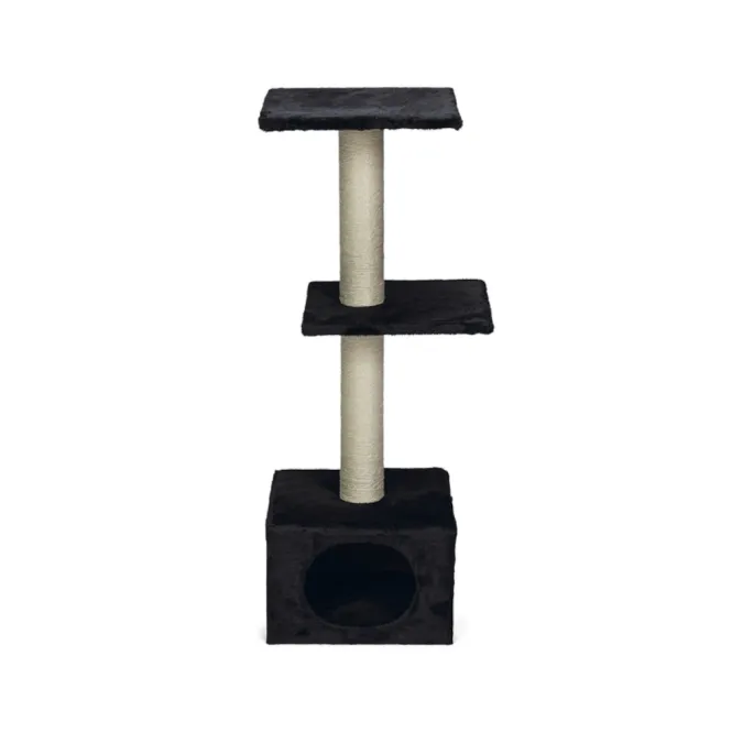 Der Kratzbaum Smaragd in tiefem Schwarz vereint gemütliche Rückzugsorte mit robusten Kratzmöglichkeiten. Eine einladende Höhle mit 18 cm großem Eingang lädt zum Verstecken und Entspannen ein, während zwei weiche Plüsch-Liegeflächen pure Wohlfühlmomente bieten. Die integrierten Sisal-Stämme mit 9 cm Durchmesser sorgen für intensive Krallenschärf-Sessions und halten die Krallen gesund und gepflegt.