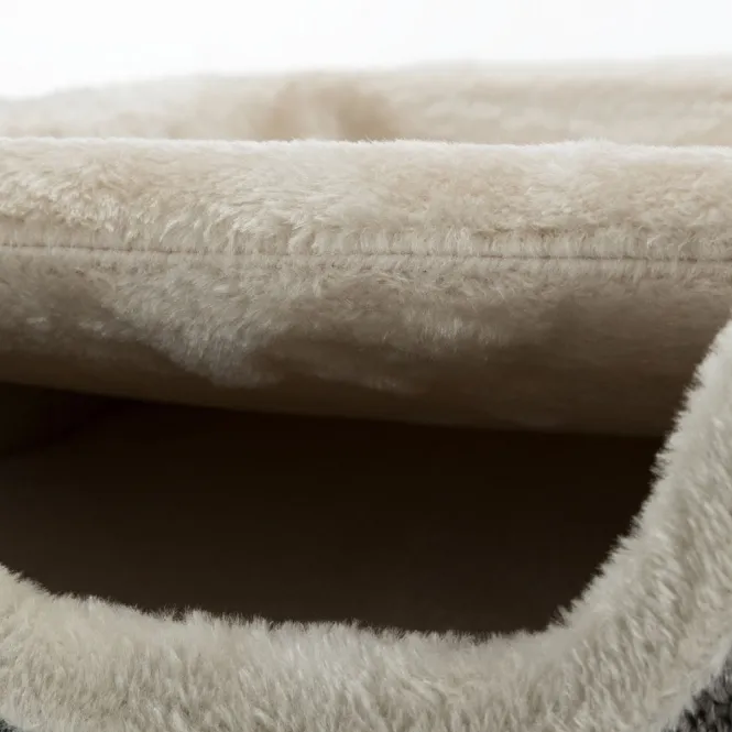 Die geräumige Höhle ist vollständig mit weichem Plüsch (Polyester) ausgekleidet und lädt zu ausgiebigen Nickerchen ein. Drei praktische Wendekissen sorgen für Abwechslung und Frische – einfach per Handwäsche pflegen. In anthrazit/lichtgrau-Tönen passt sie nahtlos in jedes Heiminterieur.