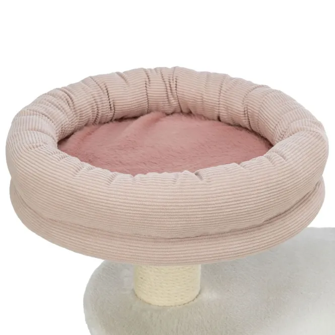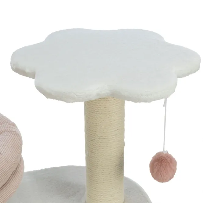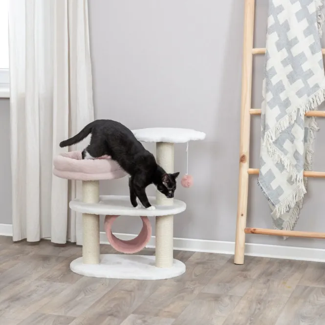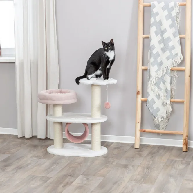 Entdecken Sie den perfekten Rückzugsort für Ihre Katze: ein stabiler Kratzbaum in sanften Weiß-Altrosa-Nuancen, der Komfort und Stil nahtlos vereint und sich harmonisch in Ihr Zuhause einfügt.