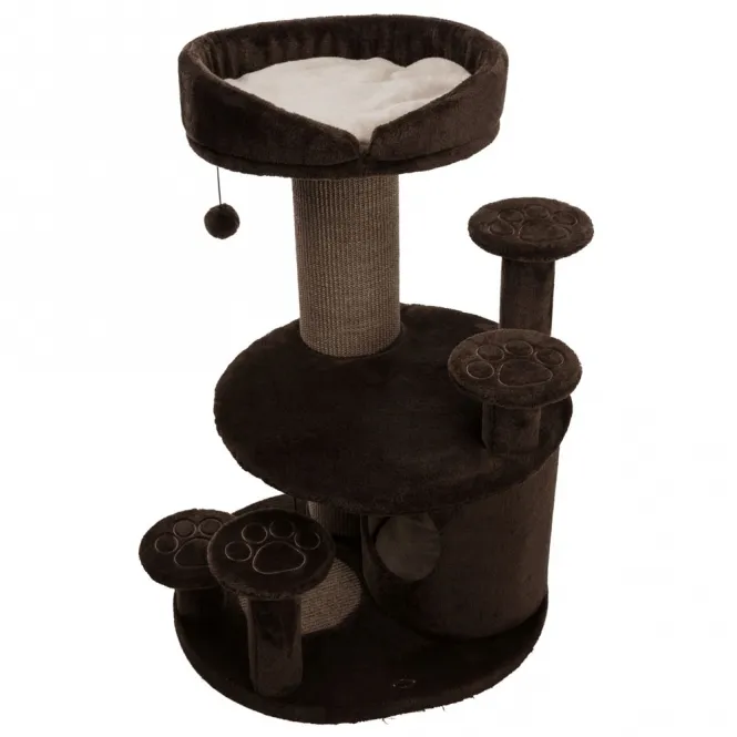 Hänge-Spielzeuge an Bändern wecken den inneren Kätzchengeist, ohne zu überfordern. In harmonischen Braun- und Beige-Nuancen integriert sich der Kratzbaum nahtlos – bei kompakter 69 x 59 cm Grundfläche und 96 cm Höhe passt er überall.