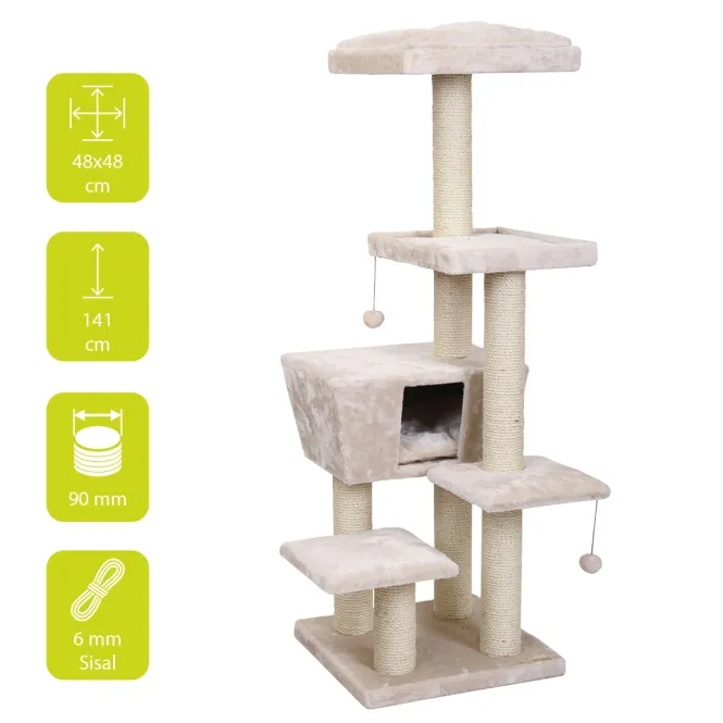Dieser moderne Kratzbaum bietet vielfältige Liege- und Sitzpositionen, ein gemütliches Schlafhäuschen sowie abwechslungsreiche Spielmöglichkeiten. Die robuste Konstruktion aus komplett verklebtem Sisal und hochwertigem Plüsch garantiert jahrelange Freude und Widerstandsfähigkeit gegen täglichen Einsatz.