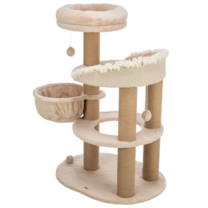 Mit 114 cm Höhe und kompakter Grundfläche von 77 × 58 cm passt der Kratzbaum nahtlos in moderne Interiors. Das beige Design unterstreicht den entspannten Boho-Vibe und bietet reichlich Platz zum Klettern, Balancieren und Entspannen.