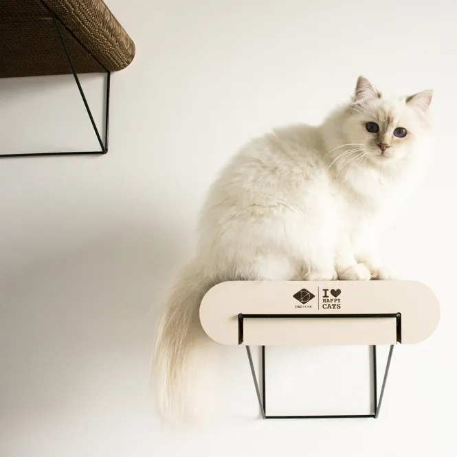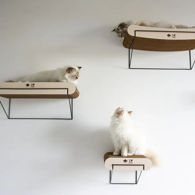 Befestigen Sie es flexibel an jeder geeigneten Wandstelle. Kombinieren Sie die verschiedenen Formen zu einer personalisierten Katzenautobahn: als Plattform, Sprungfeld oder gemütlicher Nische. Die schlanke Metallkonstruktion gewährleistet Stabilität und ein zeitloses Erscheinungsbild. Bei Abnutzung einfach das Pappe-Element erneuern – nachhaltig und unkompliziert.