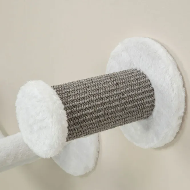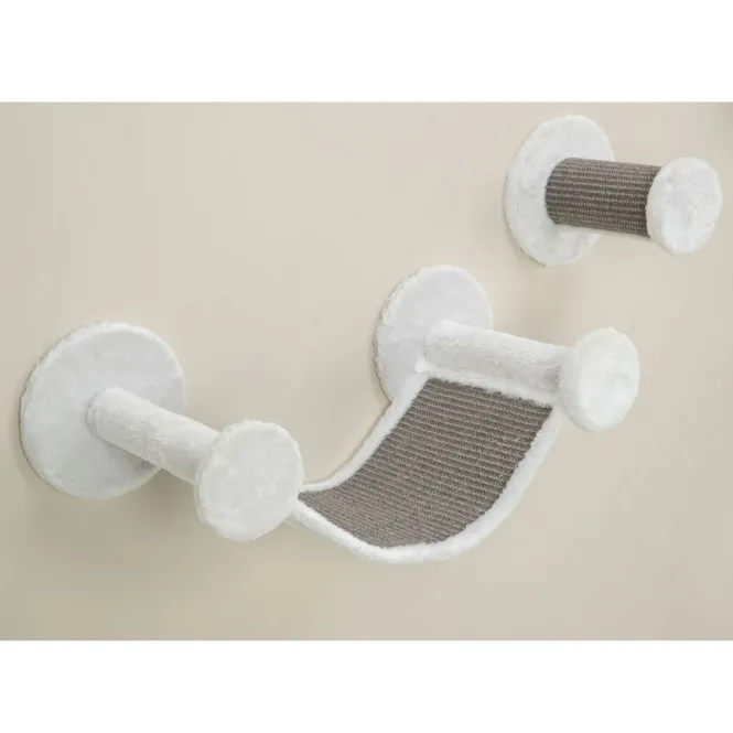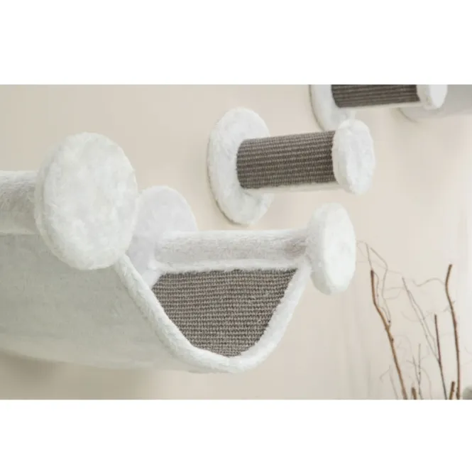 Die Liegemulde (78 x 30 x 30 cm) mit herausnehmbarem Plüschkissen lädt zum entspannten Ausruhen ein – einfach per Handwäsche gepflegt. Zwei robuste Stufen (ø 18 x 22 cm) und eine Hängematte (78 x 20 x 29 cm) aus strapazierfähigem Sisal gewährleisten sicheren Halt und ideale Krallenpflege. In weiß-grauen Tönen fügt sich das Set harmonisch ein.