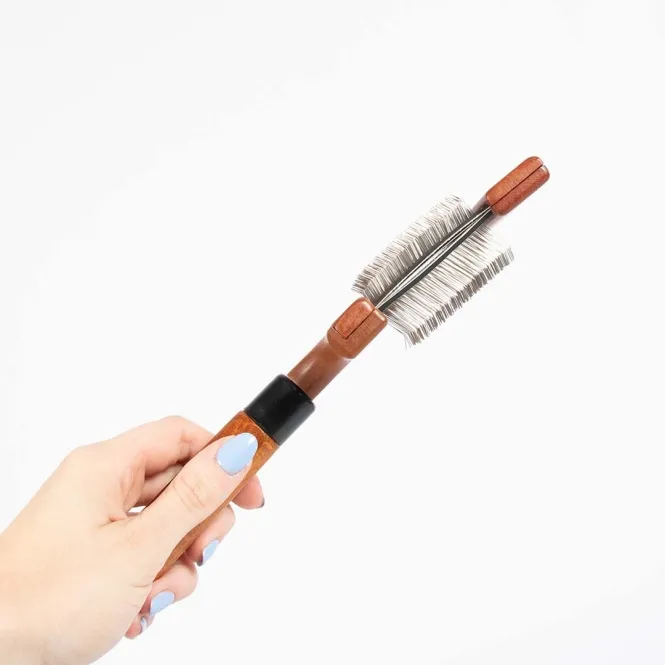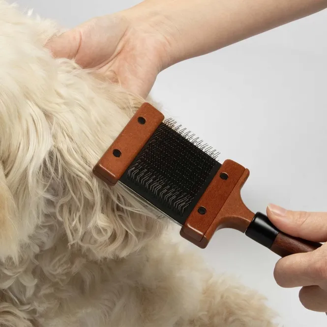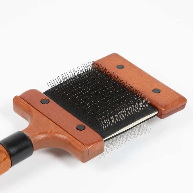 Der ergonomische Griff aus FSC-zertifiziertem Buchenholz mit subtiler dunkel gebeizter Finish liegt perfekt in der Hand. Mit Maßen von 28 x 8 x 3,5 cm ist diese Bürste Ihr zuverlässiger Begleiter für Hunde und Katzen – unabhängig vom Felltyp, besonders bei Langhaaren ein Traum.