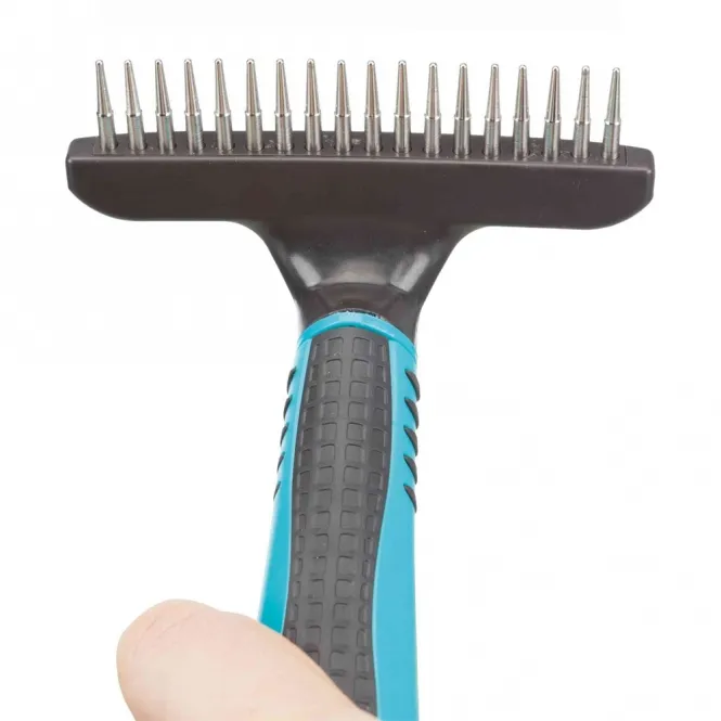 Mit seinem ergonomischen Kunststoffgriff und der rutschfesten Gummieinlage liegt der Entwirrer sicher in der Hand, auch bei längeren Sessions. Die rotierenden, abgerundeten Zinken mit einer Länge von rund 2 cm gleiten sanft durch die Unterwolle und lösen Verfilzungen, ohne die Haut zu reizen.