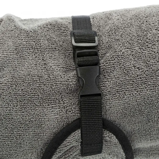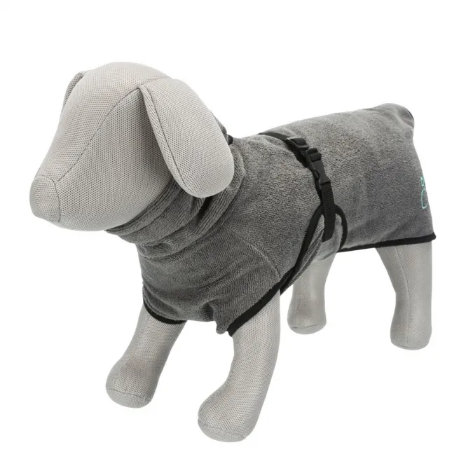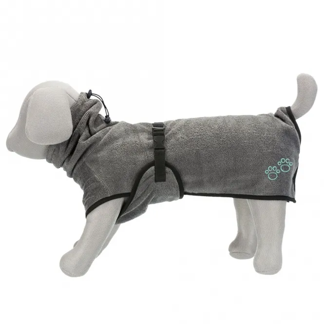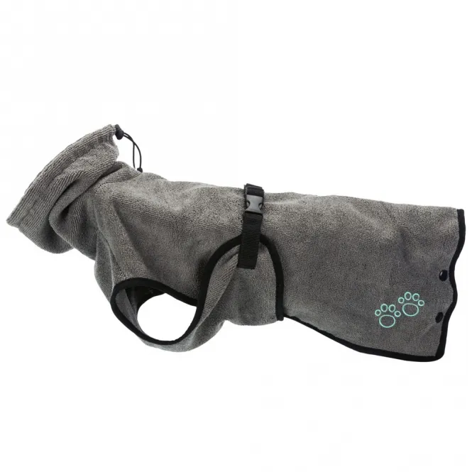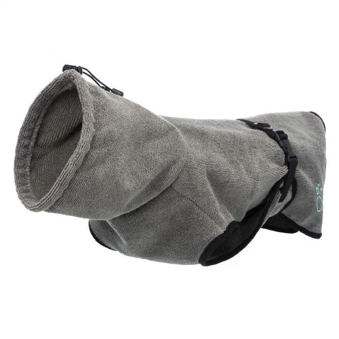 Aus feinstem Frottee aus reiner Baumwolle gefertigt, umhüllt dieser Mantel Ihren Vierbeiner sanft und verhindert lästiges Frösteln. Der großzügige Kragen mit elastischem Band passt sich mühelos an, während Brustlatz und verstellbarer Bauchgurt mit stabiler Schnalle für einen sicheren Halt sorgen. Praktische Druckknöpfe am Schwanzbereich machen das An- und Ausziehen zum Kinderspiel.
