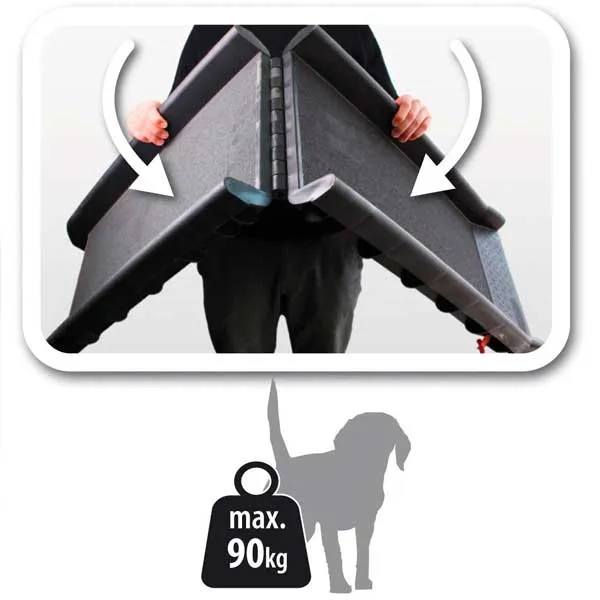 Mit einem Eigengewicht von nur wenigen Kilos lässt sie sich kinderleicht transportieren. Gefaltet nimmt sie minimal Platz ein und passt in jeden Kofferraum. Belastbar bis 90 kg eignet sie sich für Hunde jeglicher Größe – von Kleinen bis zu echten Riesen.