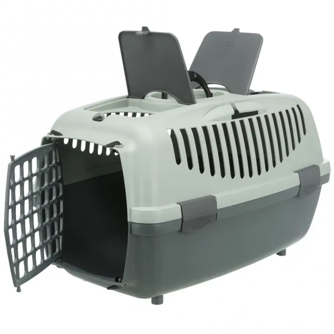 Gefertigt aus robustem, recyceltem Material in anthrazit/grau-grün, bietet diese Box optimale Belüftung durch großzügige Gitter und eine stabile Schubladenkonstruktion für einfaches Ein- und Aussteigen. Der ergonomische Tragegriff sorgt für bequemen Transport, während die Maße von ca. 40 × 38 × 61 cm ausreichend Platz für entspanntes Reisen schaffen.