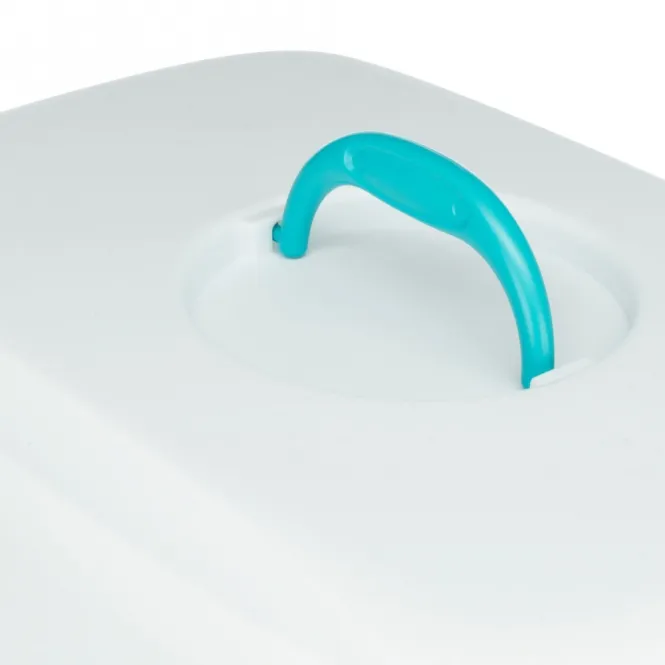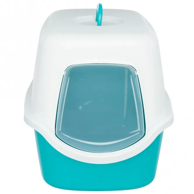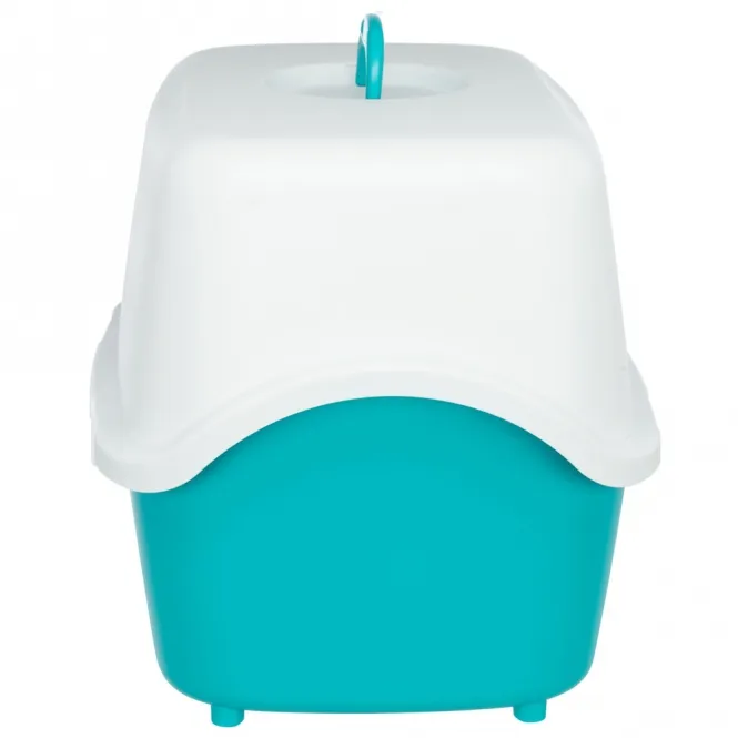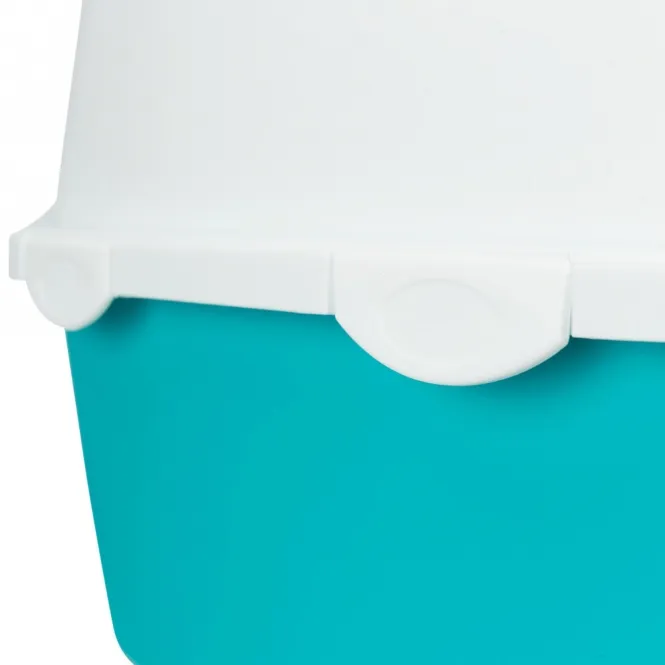 Schaffen Sie ein frisches und geruchsfreies Zuhause für Ihre Katze mit dieser stilvollen Lösung in lebendigem Türkis und Weiß.