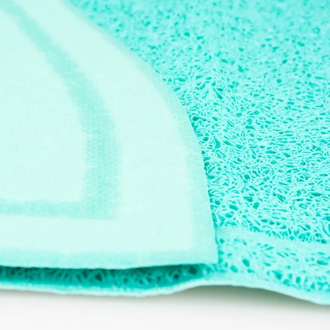 Entdecken Sie den smarten Begleiter für ein streufreies Zuhause: Die halbrunde Matte in petrolblau fängt jeden Krümel auf und hält den Boden makellos.